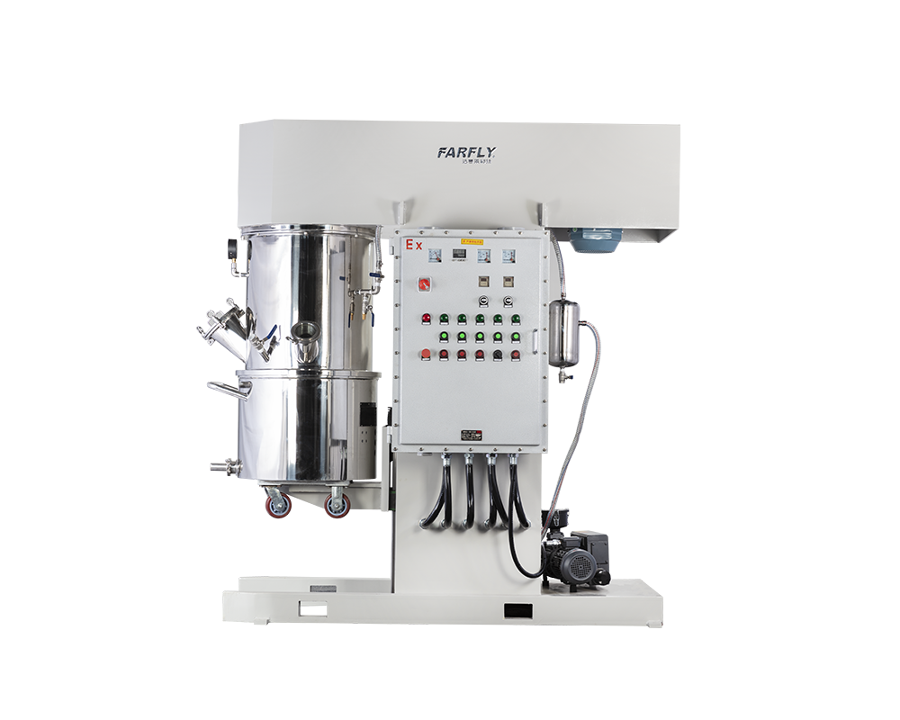 ①Efficient mixing:There is a scraper on the planetary frame that rotates with the planetary frame,close to the barrel wall and continuously scrapes it,so that there is no retained material on the barrel wall and the mixing effect is improved.